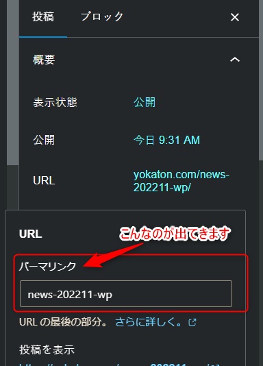 「URL」をクリックするとパーマリンクの入力用のTextBOXが出てきます。