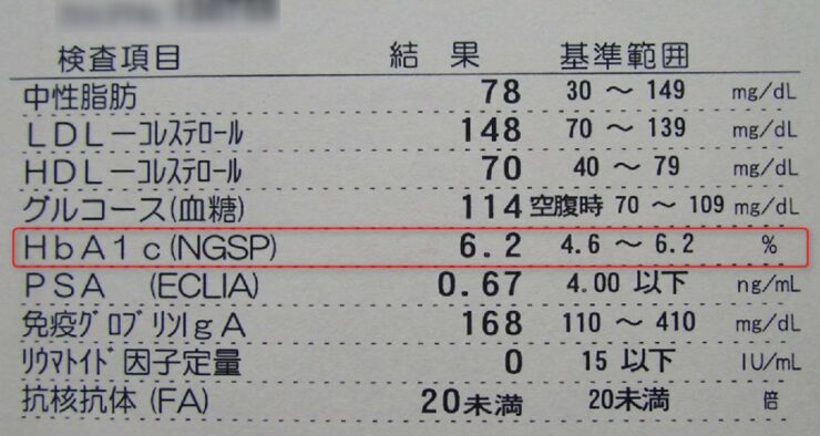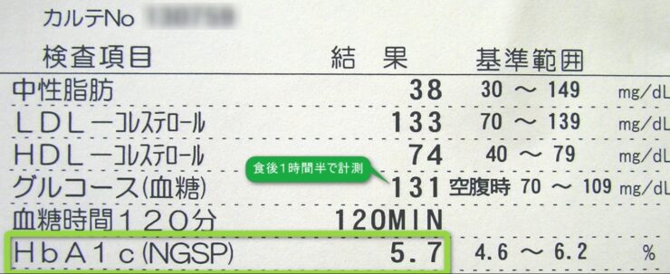 19/07/27追記 ずっと安定して順調です。 5月の検査時点で5.7(旧基準の5.3)と、もう完全に普通人。 体重は60kgで安定して、何を食っても飲んでも増えなくなりました。 2017/03/16 空腹時血糖値=270 HbA1C=11.5 血圧=160 2018/07/09 空腹時血糖値=136 HbA1C= 7.2 血圧=123 2019/05/27 食後90分血糖値=131 HbA1C= 5.3 血圧=125 2019/12時点で、医者から「薬は不要」と言われています。 糖質制限食でHbA1C改善、ダイエットにも成功しました。