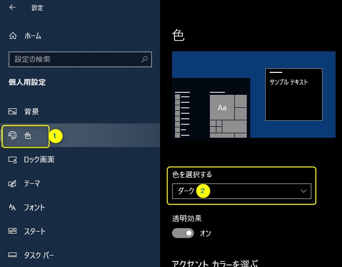 ①左側メニューの「色」 → ②右側の「色を選択する」(ダーク)
